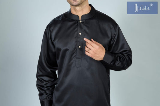 Full Sleeves Collar Men's Thobe with Buttons - Indian Shiny Fabric - Black