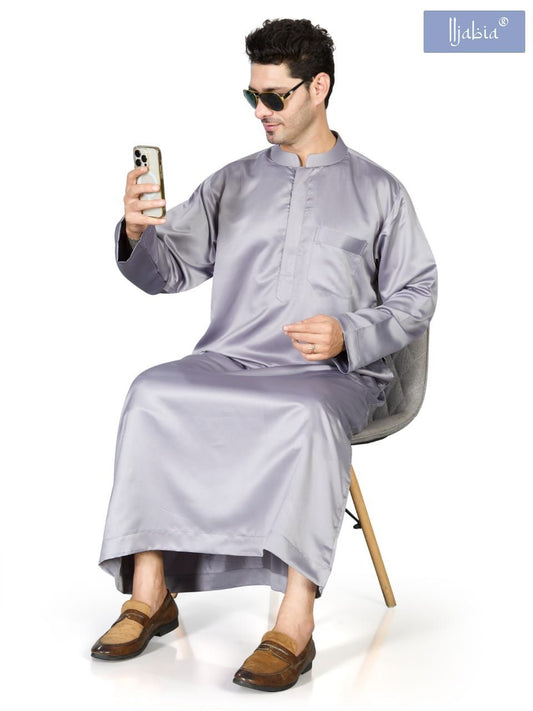 Full Sleeves Collar Men's Thobe - Indian Shiny Fabric - Light Grey