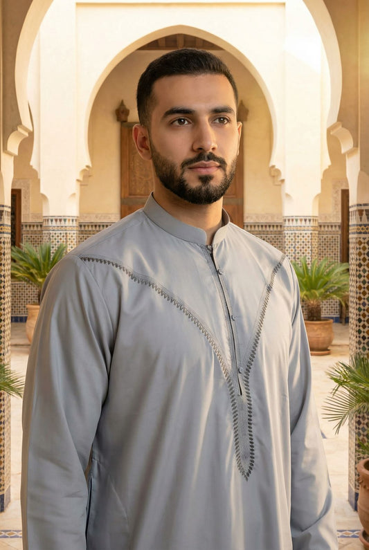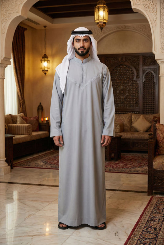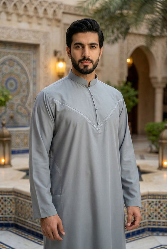 Emirati Mens Omani Thobe - Indian Shiny - Contrast embroidery - Grey