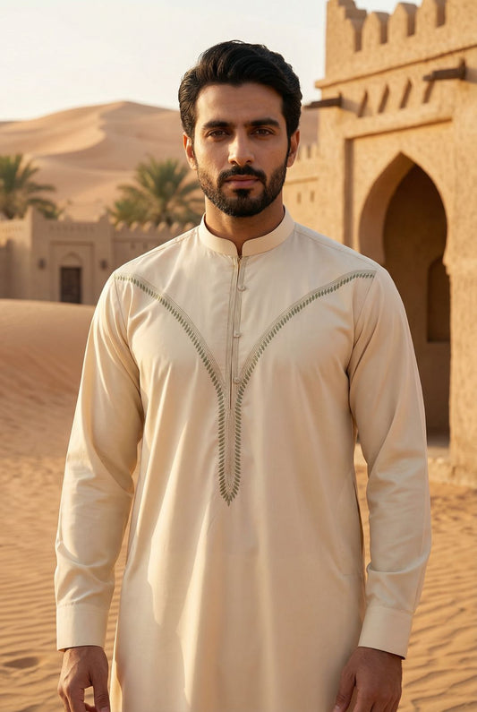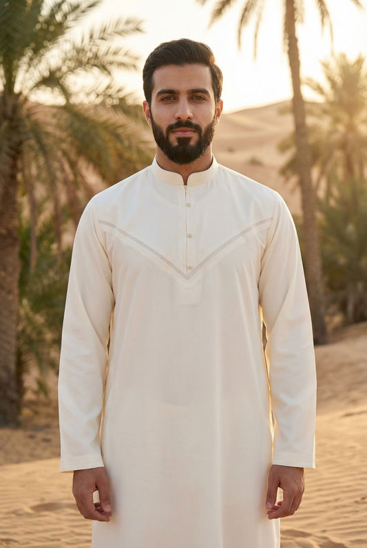 Mens Collar Omani Thobe - Full Sleeves - Cream