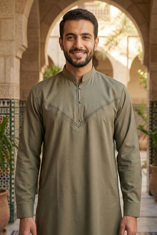 Mens Collar Omani Thobe - Full Sleeves - Olive Green