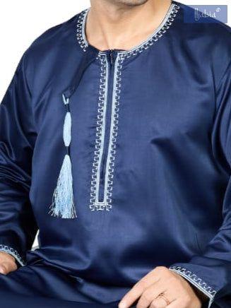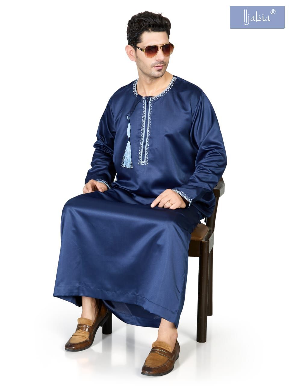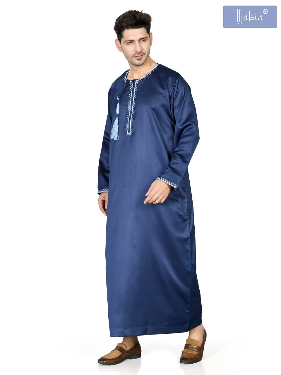 Full Sleeves Omani Men's Thobe - Khalifa - Indian Shiny Fabric - Navy Blue