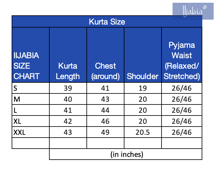 | IIJABIA SIZE CHART | Kurta Length | Chest (around) | Shoulder | Pyjama Waist (Relaxed/Stretched) |