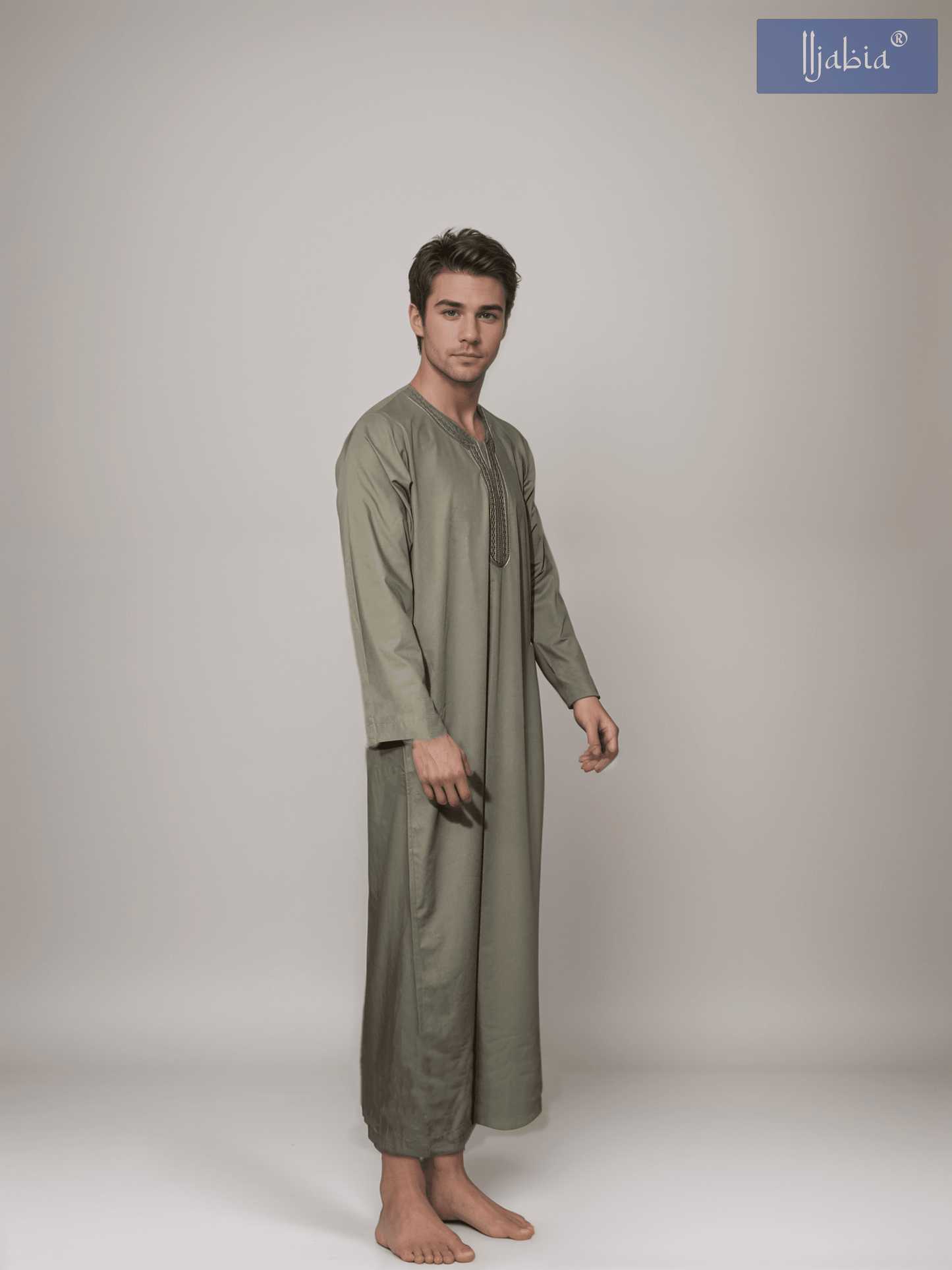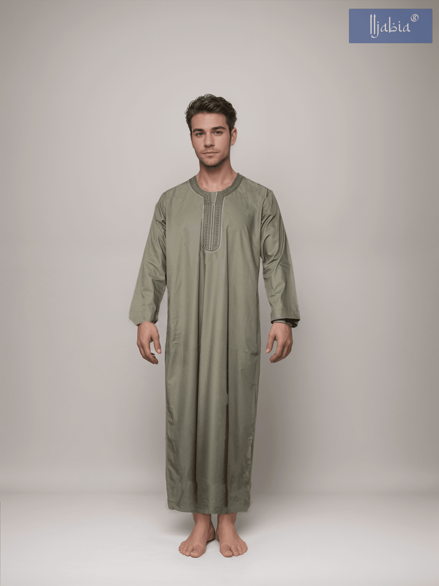 Moroccan Embroidery Mens Thobe - Full Sleeves - Military Green