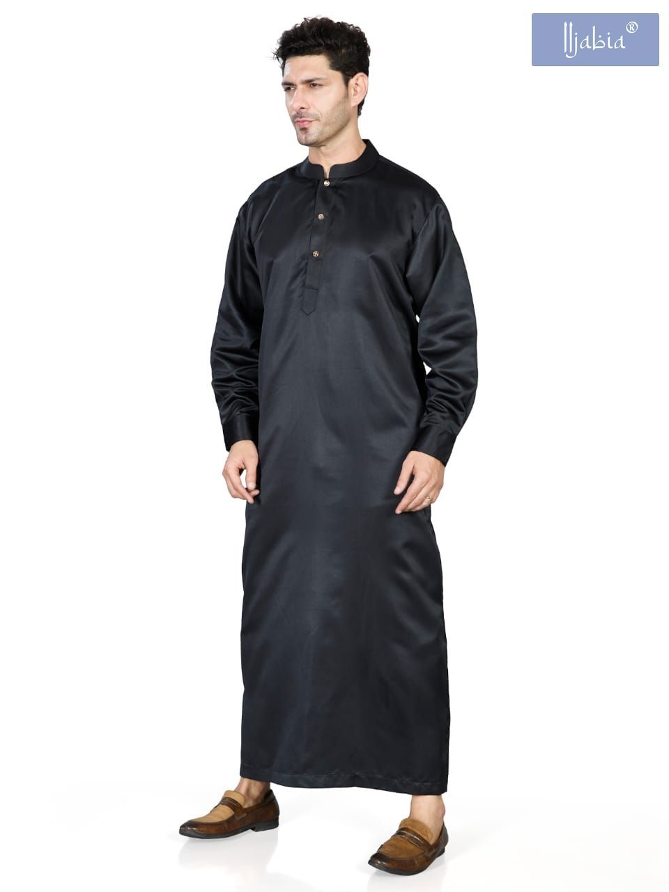 Full Sleeves Collar Men's Thobe with Buttons - Indian Shiny Fabric - Black
